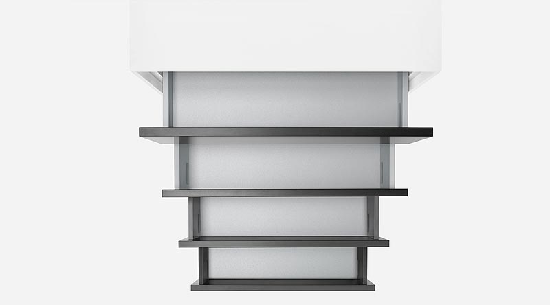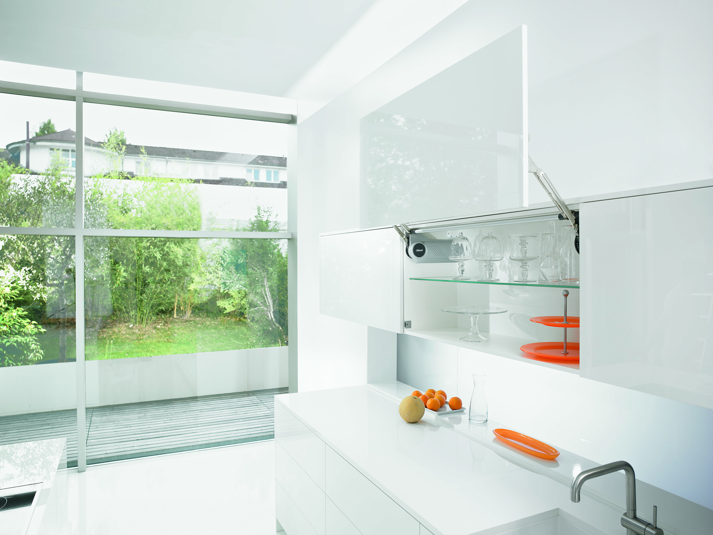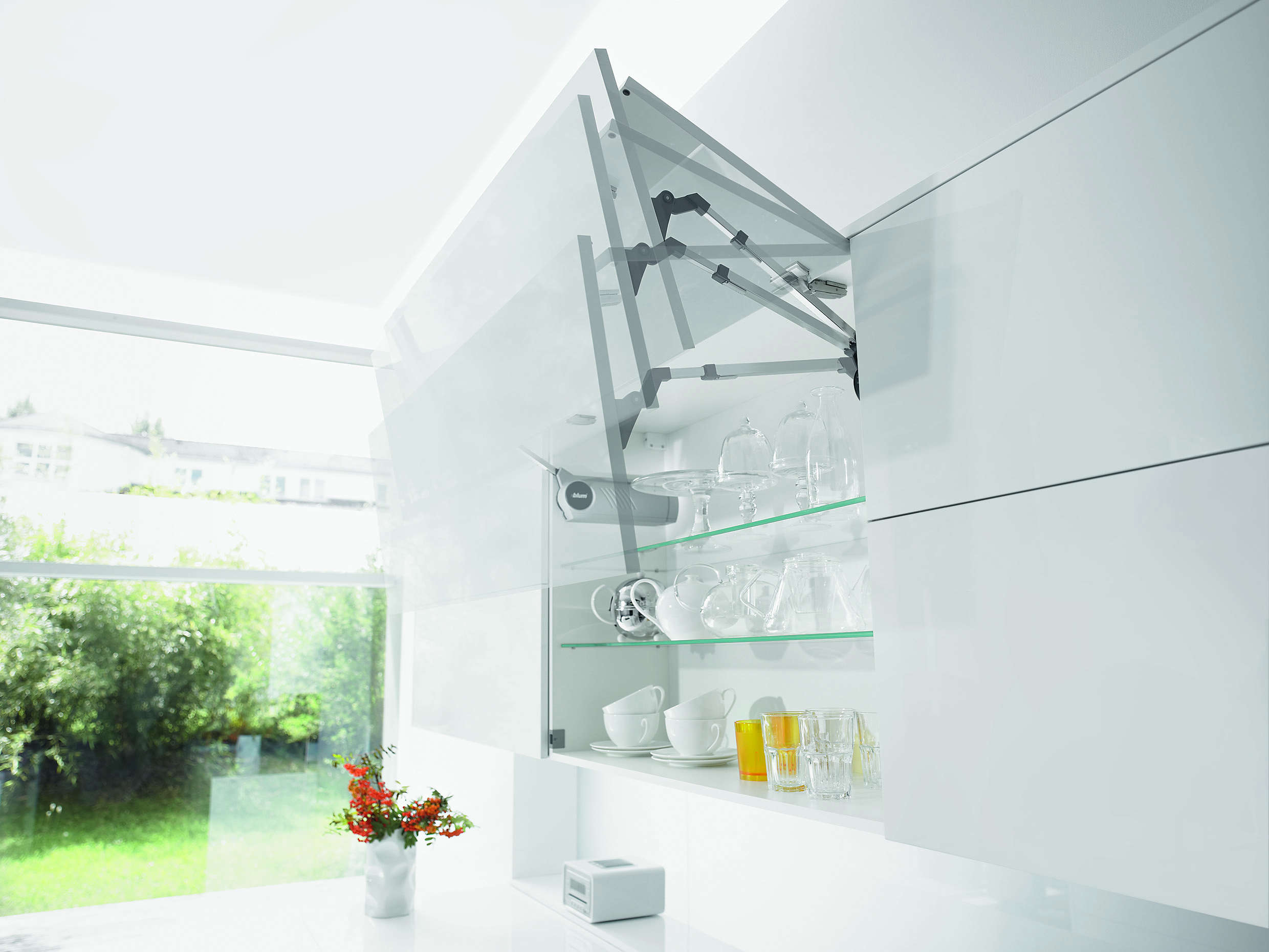 AVENTOS HS omogoča obračanje velikega enodelnega preklopa nad korpusom. S tem smo omogočili praktično dostopnost do notranjosti omarice. Prav tako se lahko izvedejo tudi variante v oblikovanju kot so okrasni venci ali bočnice.