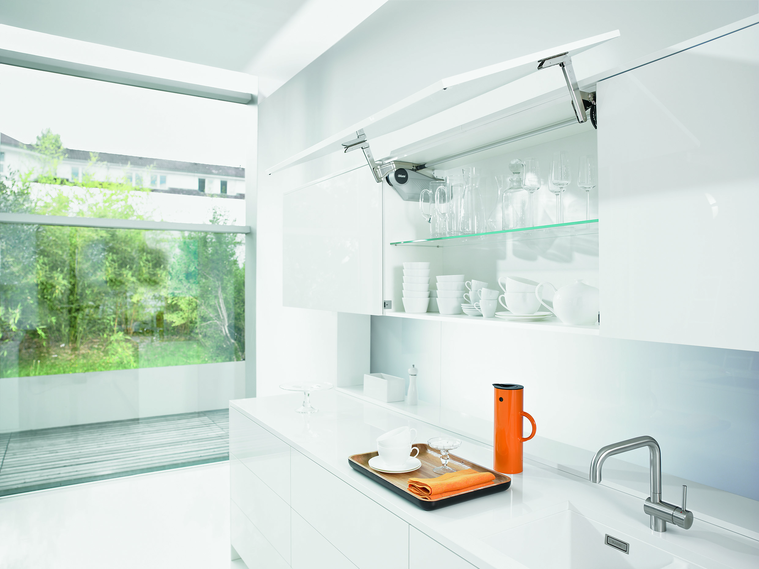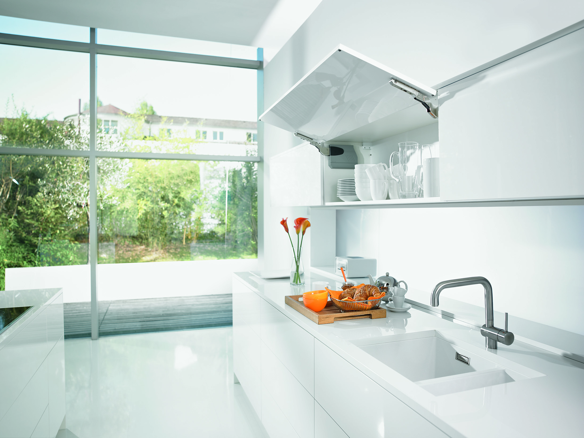 AVENTOS HF – sistem okovja za dvodelne fronte, ponuja rešitev za visoke in srednje visoke zgornje omarice z dvodelnimi frontami, tako kot v kuhinji, tako tudi v ostalih delih gospodinjstva. Za direkten pristop, udobnost in svobodo gibanja.